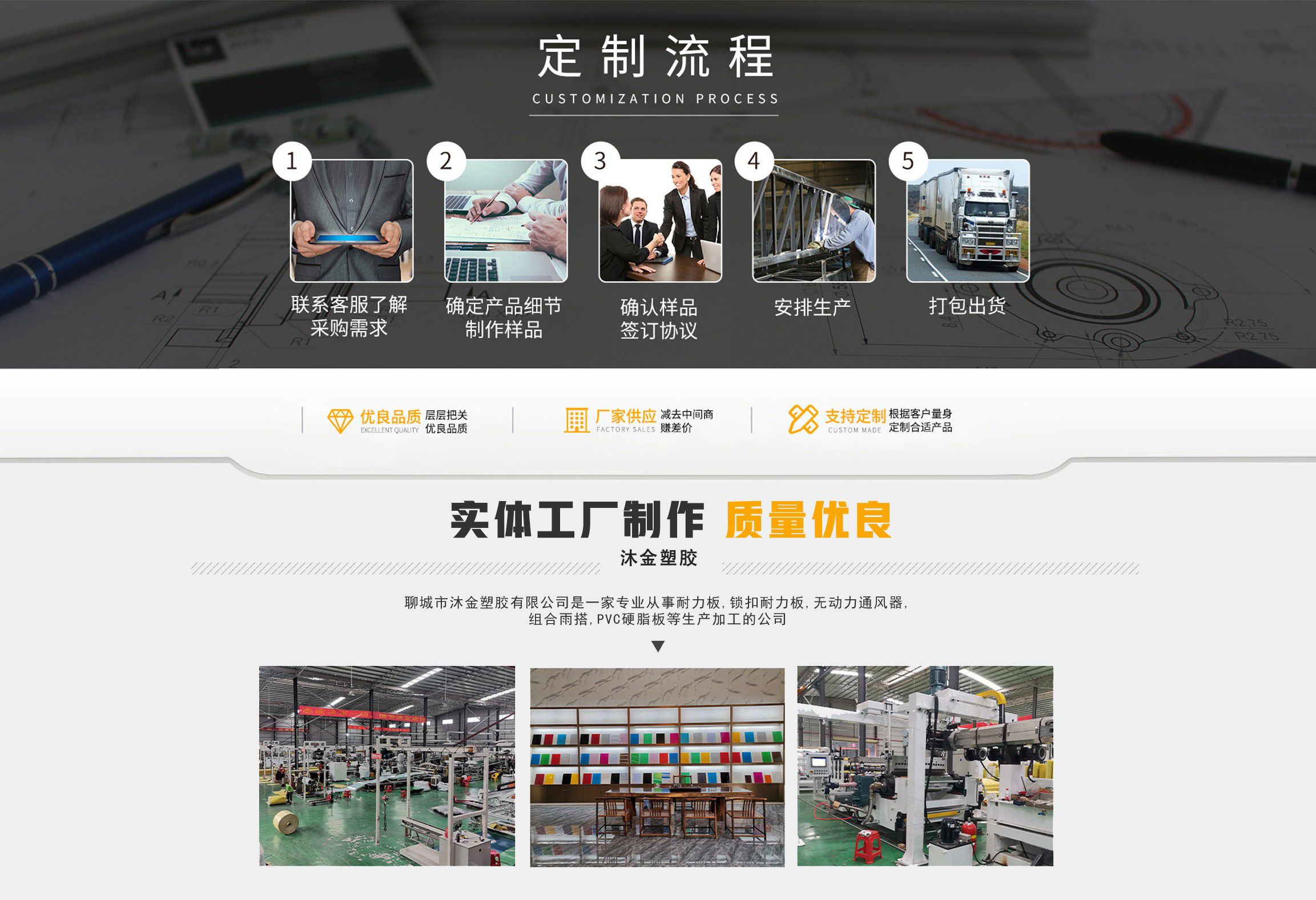 聊城市沐金塑膠有限公司注冊資金2180萬元,占地20000余平方,擁有自建廠房15000平方,員工100余名。10余年來,公司主營耐力板,鎖扣耐力板,耐力板深加工,無動力通風器,組合雨搭,PVC硬脂板,耐力板廠家等板材的發展戰略,逐漸成長為綜合性企業?! 」緭碛卸鄺l板材共擠生產線,采用世界知名品牌進口原材料和先進工藝,依據完善的ISO9001質量管理體系和ISO14001環境管理體系,為產品的卓越品質提供了強有力的保證。憑借過硬的創新能力和堅實的硬件基礎,贏創已成為國內領先的熱塑性板材生產商,產品被廣泛應用于建筑業、農業、工業、廣告業、安防行業及DIY領域?! 」臼冀K致力于通過提供最優的板材應用解決方案,為客戶創造最高的價值;堅守創新、質量、靈活、服務和速度的核心價值觀;堅持“完美的產品需要完美服務的支持”的經營理念,努力實現成為世界領先的板材與解決方案供應商的夢想。  在未來,公司將立足客戶需求,不斷改變和完善現有產品,拓展產品線和充分開發板材的應用領域,為客戶創造全方位的價值。同時更好地實現員工的價值,實現公司團隊的價值。我們將與您一起創贏未來!  企業使命:成為世界領先的板材與解決方案供應商?! 」驹妇埃和ㄟ^提供最優的板材應用解決方案,為客戶創造最高的價值?! 『诵膬r值觀:質量...